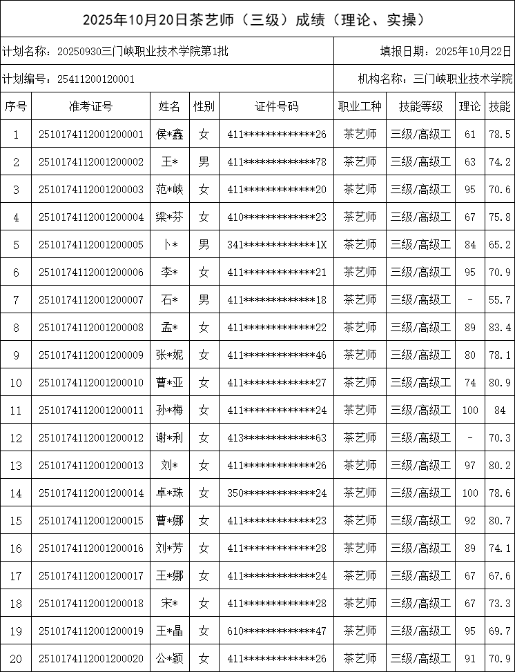 附:2025年10月20日茶艺师(三级)成绩(理论、实操)